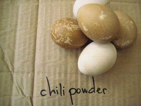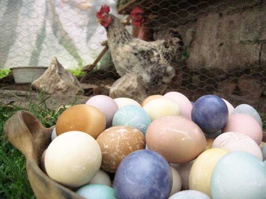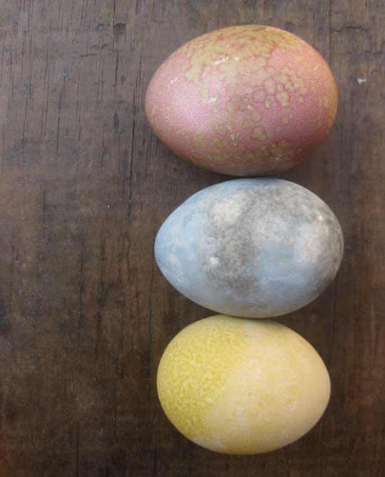 red onion skin makes beautiful dye for handmade paper and would *probably* work for eggs.