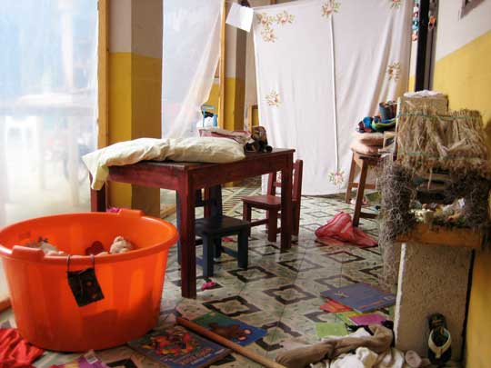This is our makeshift playroom in its usual lived-in state. An unintended bonus created when we nailed up plastic in the courtyard to keep the bedrooms warm(er), it has proven the perfect corridor for chaos. Worth noting: that mossy structure (front right) is last year’s nativity scene – repurposed into a house for the Calico Critters, the girls hung my favorite embroidered table cloth in the back to play tienda and they recently decided to rip the plastic sheeting for a clever escape route during hide and seek.