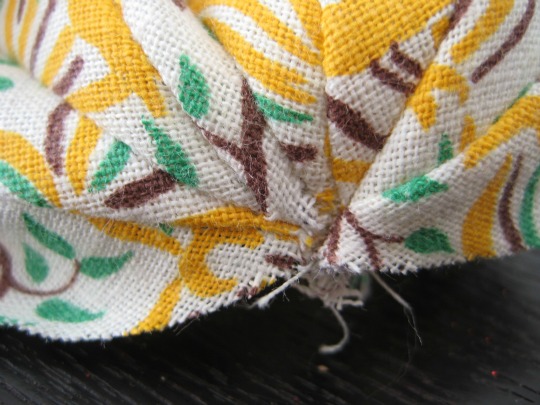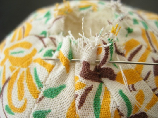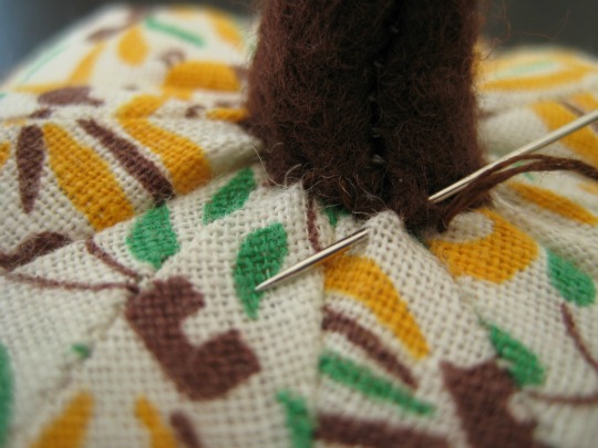 Stuff your pumpkin, using the point turner to fill out each section until it’s shapely. Knotting one end of your thread, gather stitch the top edge around the circumference of the open circle. I like to go around twice just to make sure it’s nice and strong before I pull it closed. Pull the gather string, closing the top and tucking raw edges inside as you go. Tack thread securely. (Again, no exact science here. The hole will be covered by the stem anyway.)