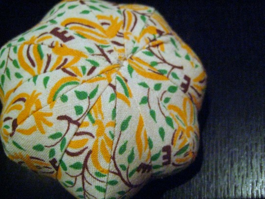 With right sides together, sew the two remaining raw edges together, creating the pumpkin sphere. It is a bit inexact aligning the points, just do your best (it’s the bottom, after all). Mine turned out like this…