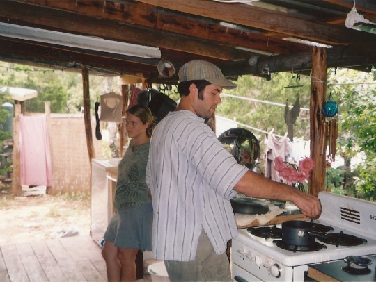 Our porch kitchen, a week after the birth of my third baby. The structure at the back left was our shower.