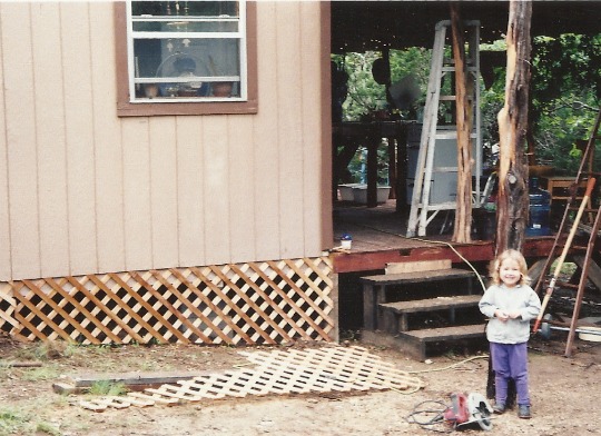 The 240 square foot house (tool shed) we lived in for three years (and where baby number three was born). To the right is the outdoor kitchen made from reclaimed fencing.