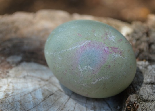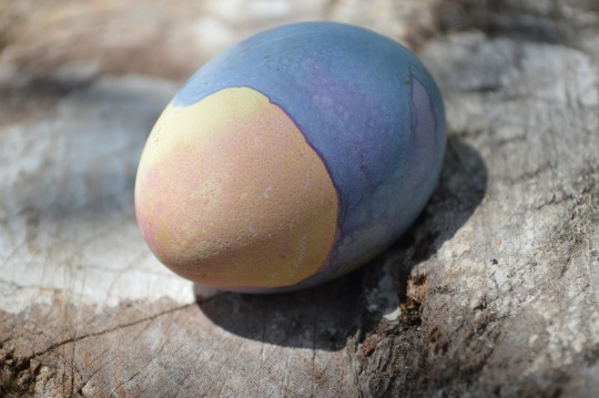 I can’t tell you how we produced the results, as the kids got a little crazy with the double dipping, but I did notice that the beets seemed to eat away some sort of film on the outside of the eggs (producing the following effect) and that you really need a strong concentration of red cabbage to obtain the turquoise we produced last year (this year it ended up a robin egg blue).