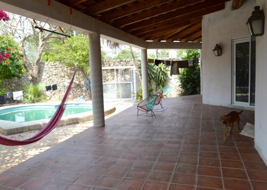 Our nearly-finished porch. The guys extended the patio, mixed all the cement by hand, poured the concrete columns, carved the hardwood beams with a chain saw and laid the tile with precision and basic tools. Oh, and you wouldn’t believe how much of it was done with a machete.