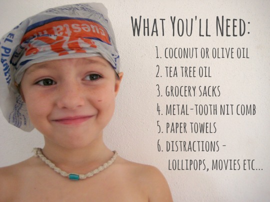 Day 1: Outfitted in old clothes and preferably outside, work olive or coconut oil through brushed hair, making sure to rub oil into the scalp. Sprinkle heads with tea tree oil, braid long hair, then cover with a plastic bag and secure with a rubber band for the day or overnight. This process suffocates the mature lice.
